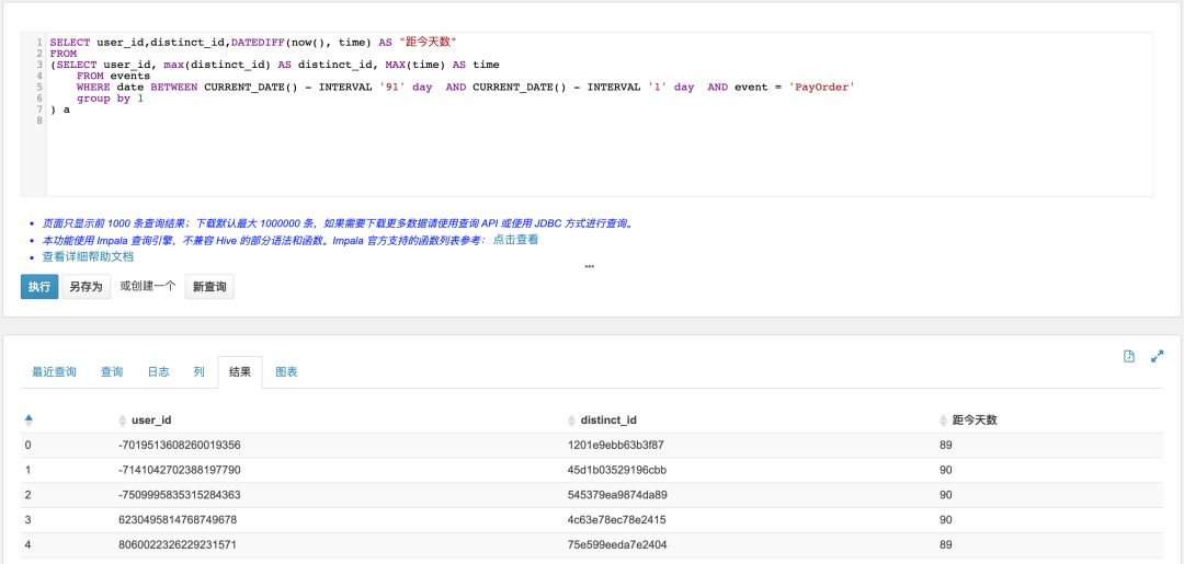 SELECT user_id,distinct_id,DATEDIFF(now(), time) AS "距今天数"FROM(SELECT user_id, max(distinct_id) AS distinct_id, MAX(time) AS timeFROM eventsWHERE date BETWEEN CURRENT_DATE() - INTERVAL '91' day AND CURRENT_DATE() - INTERVAL '1' day AND event = 'PayOrder'group by 1) a
