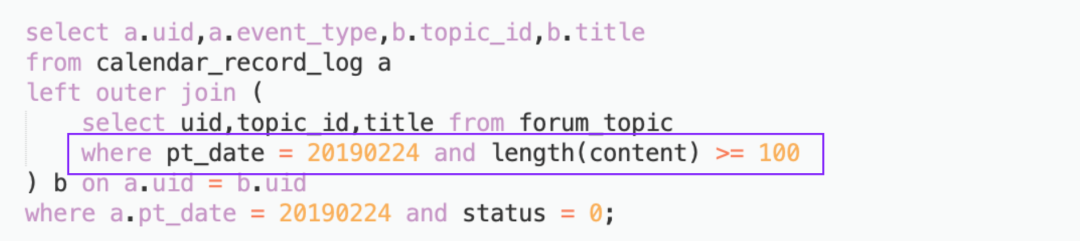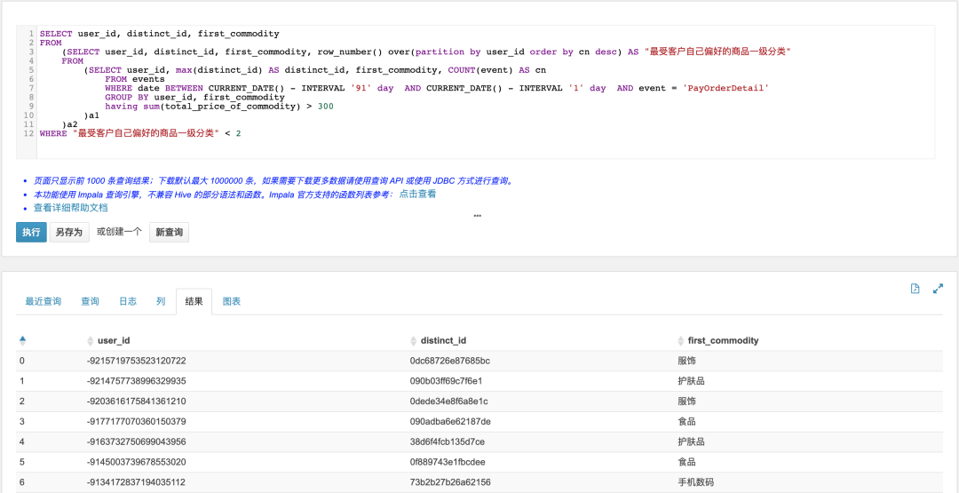 SELECT user_id, distinct_id, first_commodityFROM(SELECT user_id, distinct_id, first_commodity, row_number() over(partition by user_id order by cn desc) AS "最受客户自己偏好的商品一级分类"FROM(SELECT user_id, max(distinct_id) AS distinct_id, first_commodity, COUNT(event) AS cnFROM eventsWHERE date BETWEEN CURRENT_DATE() - INTERVAL '91' day AND CURRENT_DATE() - INTERVAL '1' day AND event = 'PayOrderDetail'GROUP BY user_id, first_commodityhaving sum(total_price_of_commodity) > 300)a1)a2WHERE "最受客户自己偏好的商品一级分类" < 2