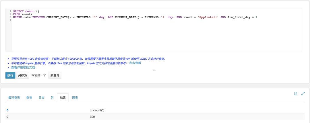 SELECT count(*)FROM eventsWHERE date BETWEEN CURRENT_DATE() - INTERVAL '1' day AND CURRENT_DATE() - INTERVAL '1' day AND event = 'AppInstall' AND $is_first_day = 1