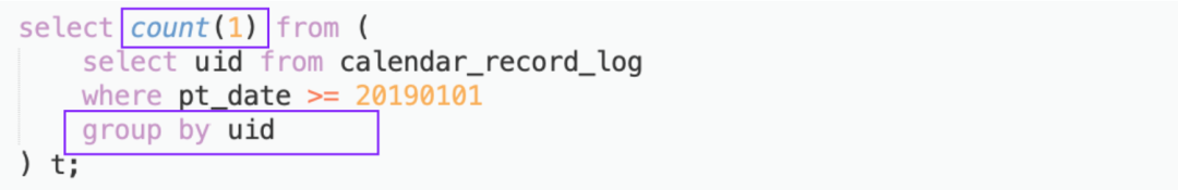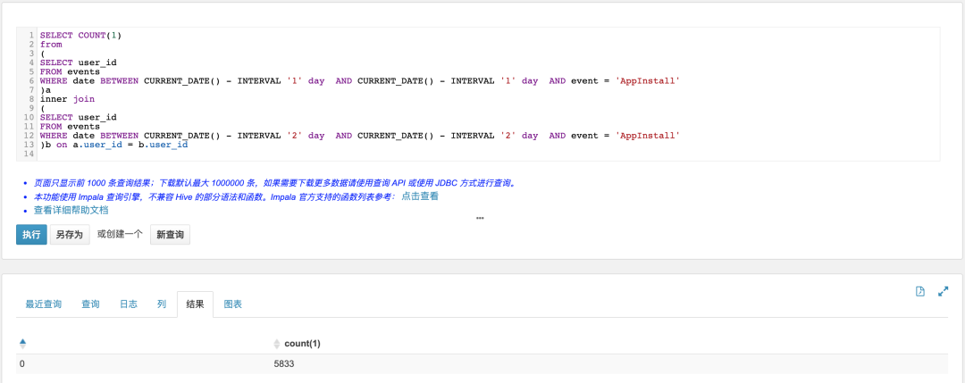 SELECT COUNT(1)from(SELECT user_idFROM eventsWHERE date BETWEEN CURRENT_DATE() - INTERVAL '1' day AND CURRENT_DATE() - INTERVAL '1' day AND event = 'AppInstall')ainner join(SELECT user_idFROM eventsWHERE date BETWEEN CURRENT_DATE() - INTERVAL '2' day AND CURRENT_DATE() - INTERVAL '2' day AND event = 'AppInstall')b on a.user_id = b.user_id