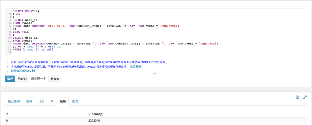 SELECT COUNT(1)from(SELECT user_idFROM eventsWHERE date BETWEEN '2018-01-01' AND CURRENT_DATE() - INTERVAL '2' day AND event = 'AppInstall')aleft join(SELECT user_idFROM eventsWHERE date BETWEEN CURRENT_DATE() - INTERVAL '1' day AND CURRENT_DATE() - INTERVAL '1' day AND event = 'AppInstall')b on a.user_id = b.user_idWHERE b.user_id is null