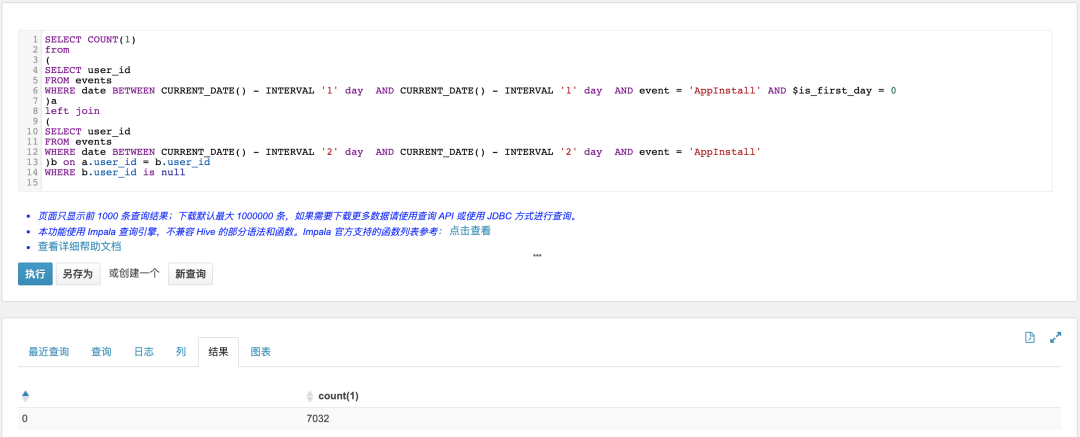 SELECT COUNT(1)from(SELECT user_idFROM eventsWHERE date BETWEEN CURRENT_DATE() - INTERVAL '1' day AND CURRENT_DATE() - INTERVAL '1' day AND event = 'AppInstall' AND $is_first_day = 0)aleft join(SELECT user_idFROM eventsWHERE date BETWEEN CURRENT_DATE() - INTERVAL '2' day AND CURRENT_DATE() - INTERVAL '2' day AND event = 'AppInstall')b on a.user_id = b.user_idWHERE b.user_id is null