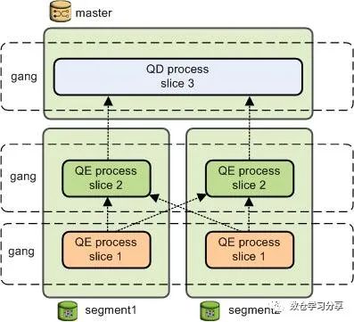 Related processes that are working on the same slice of the query plan but on different segments are called gangs。As a portion of work is completed, tuples flow up the query plan from one gang of processes to the next. This inter-process communication between the segments is referred to as the interconnect component of Greenplum Database.