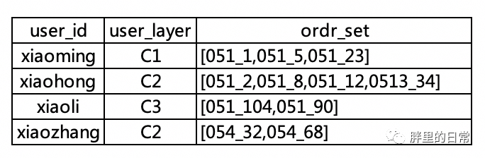 举个例子,现在有这么一张表A,是用户的订单信息表,包括用户id、用户等级、订单信息,长这样: