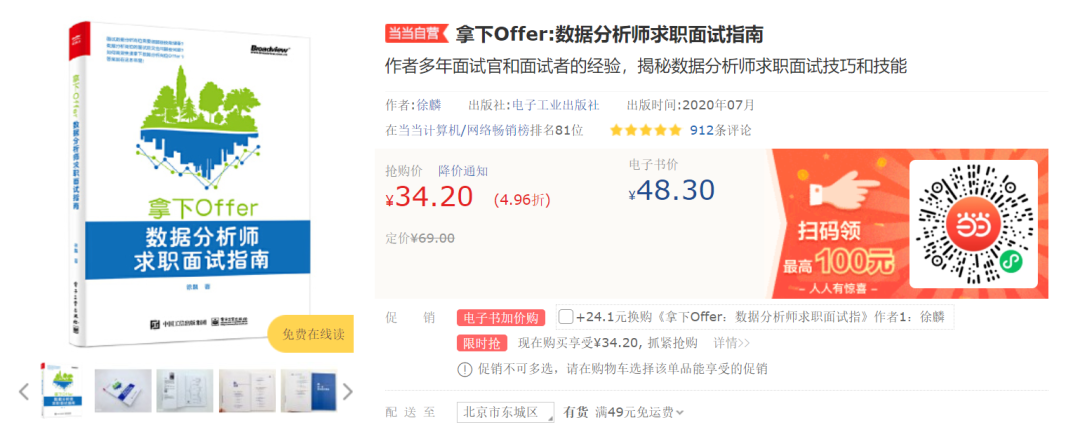 麟哥新书已经在当当上架了,我写了本书:《拿下Offer-数据分析师求职面试指南》,目前当当正在举行活动,大家可以用相当于原价5折的预购价格购买,还是非常划算的: