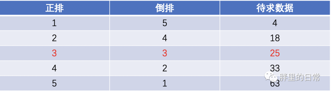假设有一组数:33,25,4,63,18(奇数个),正排和倒排编号之后如下。