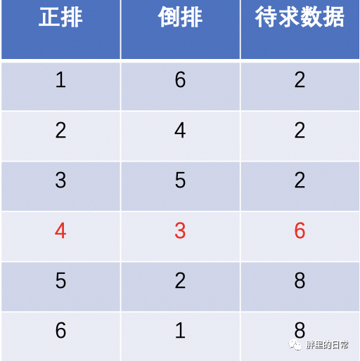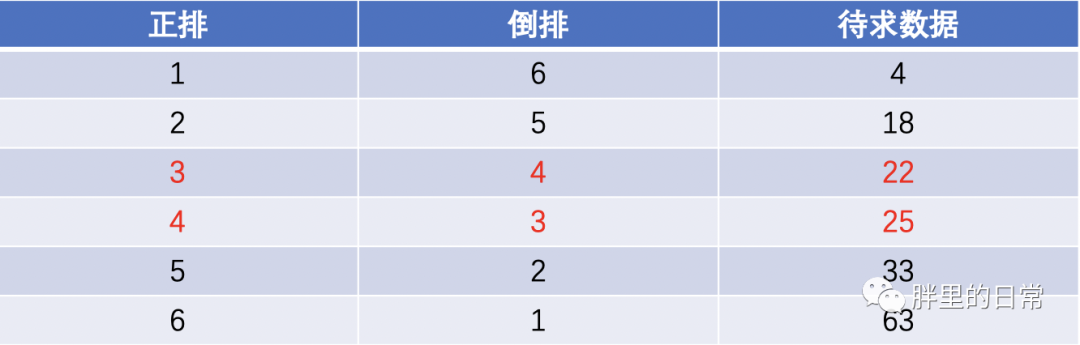 假设还有一组数:33,25,4,63,18,22(偶数个),正排和倒排编号之后如下。