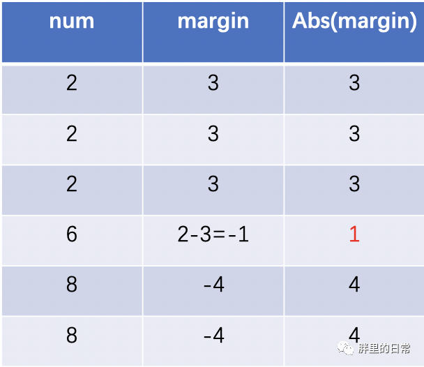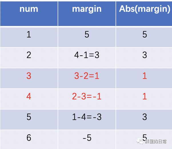 从图上可以看到,3和4对应的margin的绝对值最小,因此它们两个就是居中的数。通过这个例子是否能get此方法?是否能得到某个处于中间位置的值,或某两个处于中间位置的值?
