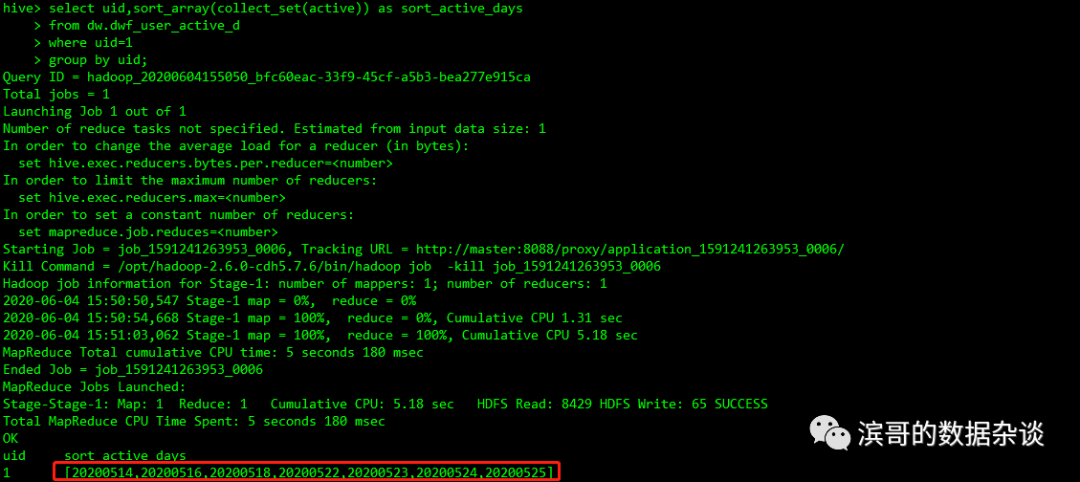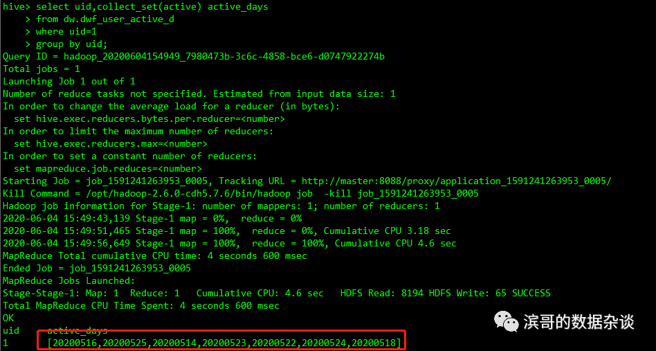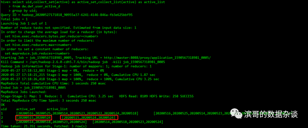 使用collect_set、collect_list函数将每个用户对应的活跃日期聚合成一个array,SQL如下所示: