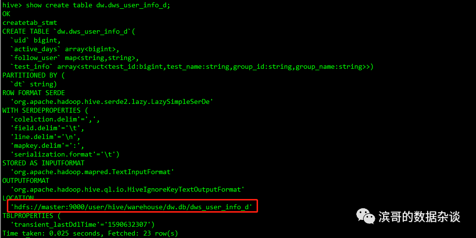 STORED AS TEXTFILE --文件存储格式,parquet、orc等其它格式