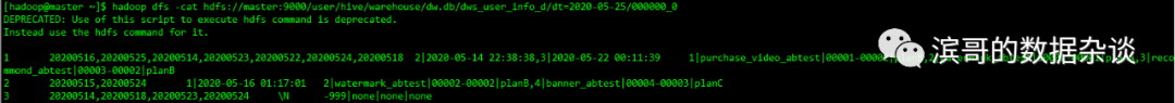 hadoop dfs -cat hdfs://master:9000/user/hive/warehouse/dw.db/dws_user_info_d/dt=2020-05-25/000000_0