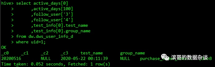 test_info使用array<struct>的嵌套方式,其中单个struct必须包含字段中定义的字段个数,字段名称,字段类型;由于可以直接把struct的字段拆分成多个字段来存储,使用struct来存储几个字段的集合比较少,而使用array<struct>的嵌套方式是比较常见的使用方式,形成表中表。