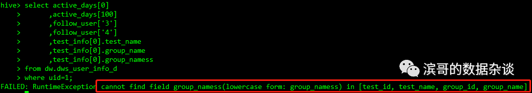 使用struct.column_name访问对应字段的值,如果struct不存在对应的column_name则报错,struct是固定的,字段名必须按照建表时定义的命名,字段值类型必须是定义的类型。