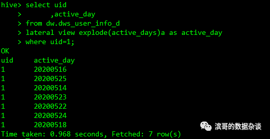 其次使用collect_set()将多行关注用户转换成array<string>数组,