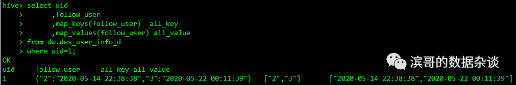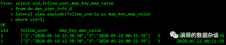 首先使用concat(uid,'|',follow_time)将2个字段和字段分隔符拼接成K-V对字符串,