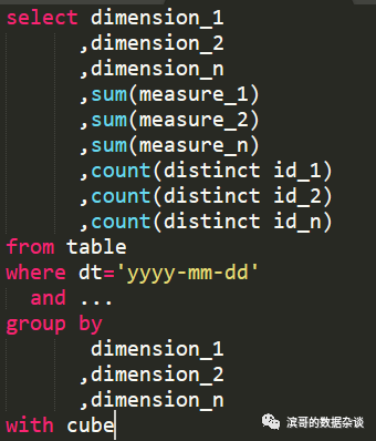 实现这个需求最常见的写法是groupby with cube,实现的伪代码如下: