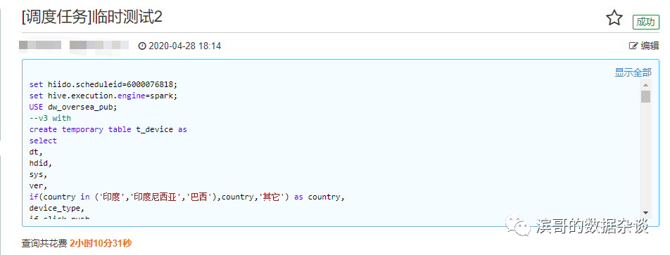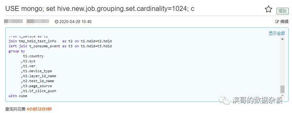 这种写法在数据量小维度少的场景是行之有效的,但是数据量大维度多的时候就会跑的很吃力。尝试第一种写法,执行了4个小时30分钟后,SQL执行记录如下所示: