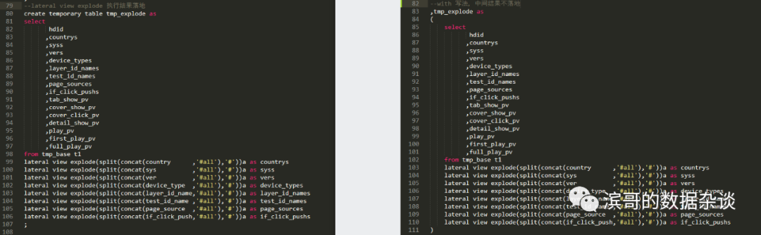 由于需要进行256次group by,成本比较高,尝试第二种写法,通过lateral view explode先把基础数据膨胀后直接进行group by,实现的伪代码如下: