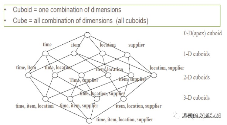 整个立方体称为1个cube,立方体中每个网格点称为1个cuboid,图中(time,item,location,supplier)和(time,supplier)都是cuboid,最多维度的组合(time,item,location,supplier)称为Basecuboid。cube的计算过程是逐层计算的,首先计算Base cuboid,然后计算维度数依次减少,逐层向上计算每层的cuboid。