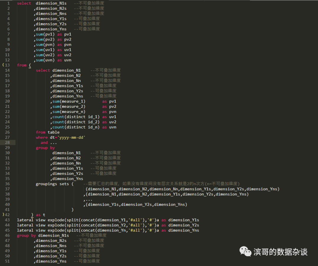改进后的方法是尝试先找到最小可叠加cube,最小可叠加cube以上的维度是用户数是可以直接进行求和(sum)计算的,执行结果和明细数据直接countdistinct的结果必须是一致的,最小可叠加维度以下的维度可以如果少可以通过groupingsets计算得到。
