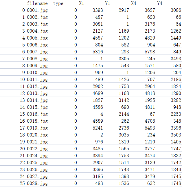 import pandas as pddata = pd.read_csv('训练集标注.csv',header = None)data_t = data.fillna(0)res = data_t[[0,1,2,3,4,5]]it = 6while it<data_t.shape[1]-4:tmp = data_t[[0,it,it+1,it+2,it+3,it+4]]#ret = pd.DataFrame()ret = []for i in range(data_t.shape[0]):if tmp.loc[i][[it,it+1,it+2,it+3,it+4]].sum()!=0:#ret = pd.concat([ret,pd.DataFrame(tmp.loc[i][[0,it,it+1,it+2,it+3,it+4]].values)],1)#print(tmp.loc[i][[0,it,it+1,it+2,it+3,it+4]].values)ret.append(tmp.loc[i][[0,it,it+1,it+2,it+3,it+4]].values)#print(it,it+1,it+2,it+3,it+4)it+=5ret = pd.DataFrame(ret)res = pd.concat([res,ret],0)#print(pd.DataFrame(ret))res.columns = ['filename','type','X1','Y1','X4','Y4']res.index = np.arange(res.shape[0])#重建索引res.to_csv('flag.csv')