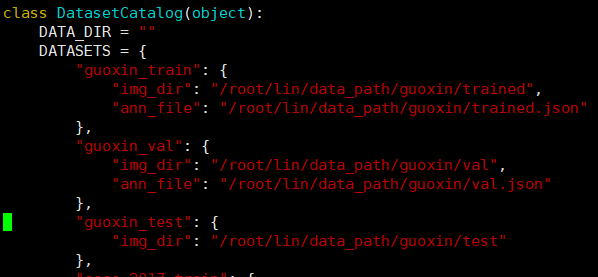 在框架的驱动函数中会在这个文件中寻找数据集的路径,这个文件在项目根目录下的maskrcnn_benchmark/config文件夹下面,在里面按照其他数据集的格式添加自己的数据集的路径(注意我将上面的data_dir改为了空):