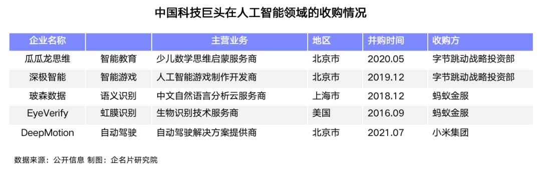 并购公司常见的目的既有业务扩张,也有对技术团队的收购。在人工智能这个偏技术的赛道,收购大部分看重被收购公司的技术能力,将技术团队收入门下,当然也有对技术落地场景的考量。