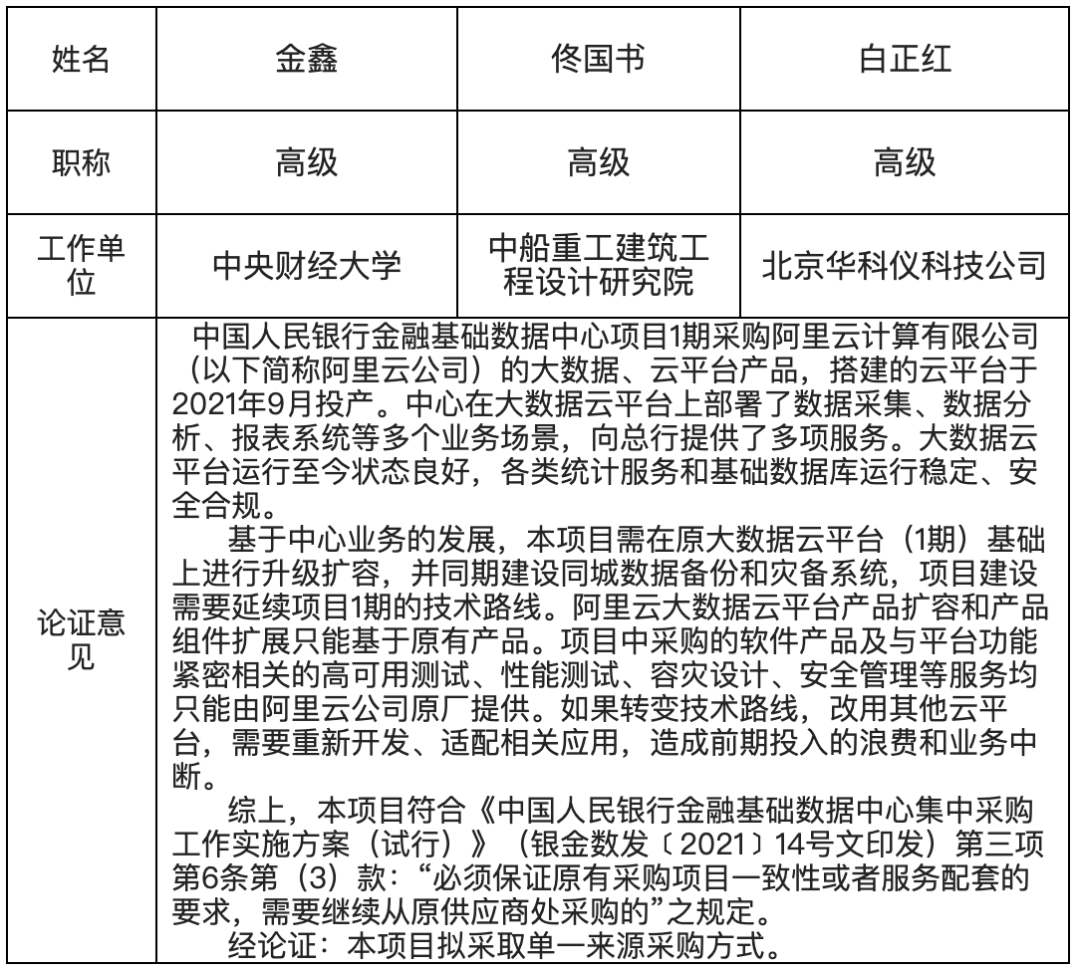 中国人民银行金融基础数据中心“大数据智能云平台升级扩容及容灾建设项目”单一来源:阿里云、1710 万元(公示)