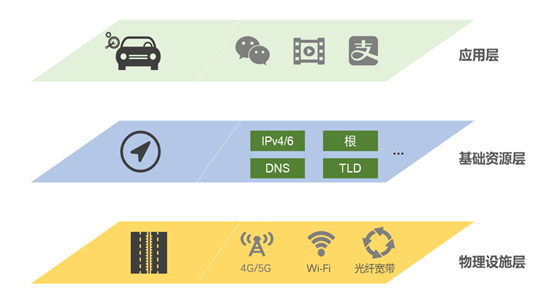 回溯传统的互联网技术产业格局,从互联网诞生之初就确立了“三层架构”,即:物理设施层、基础资源层、应用层。物理设施层是由计算、存储、网络构建的有线和无线网络,好比信息高速公路;应用层是金融、政务、购物、娱乐、搜索、社交等基于互联网的各种应用,就像跑在高速公路上的汽车。中国的汽车在中国的公路上行驶,为什么还会有断网的危险?因为两层中间还有一层基础资源层,由域名系统和IP地址组成的寻址解析系统好比导航系统,导航一旦失效就会断网。由于根服务器、顶级域名等关键基础设施就在这一层,也把这一层比做『网络根基』。