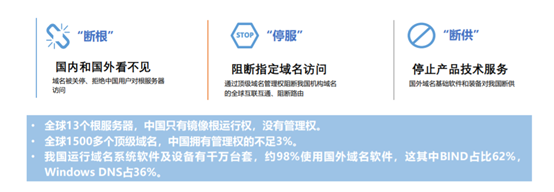 说到互联网的硬核科技,很多人往往想到的是芯片、半导体、集成电路、5G、云计算、人工智能、国产操作系统等等。其实,与蓬勃发展的互联网应用(如电商平台、短视频网站、社交平台等)和逐步走向国产化替代的物理设施(如飞腾/鲲鹏芯片、麒麟/统信操作系统等)的状况完全不同,中国仍然面临网络根基“断根”的风险。以域名系统为例,包括根、顶级域在内的互联网核心基础资源的自主率极低,承担基础服务的DNS域名解析设备98%使用的是国外软件。而域名系统技术正是我国目前被很多人所忽视的位于基础资源层的一类重要硬核科技。