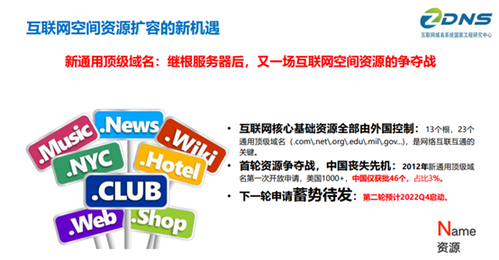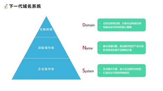 2.Name,『名 』是指资源:过去用户只能申请二级域名注册,新顶级域名的启动,开启了全球互联网空间资源发展的新契机。企业和机构可以申请运行类似.com这样的顶级域名。这是全球核心资源的再分配。要在规则制定、平台建设、技术标准等方面做好充足准备,为数字经济的发展、新基建的建设储备优质资源。