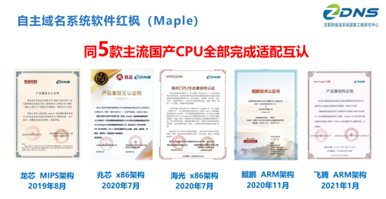经过近十年打磨,ZDNS已经推出了自主研发的域名系统基础软件“红枫(Maple DNS)”。“红枫”采用全新架构设计,在高性能解析、多线路智能调度、快速数据更新、扩展性等多方面实现了大幅领先,可实现百万级查询能力,相比国外同类软件获得数十倍性能提升,为抢占全球互联网基础软件市场,提升在国际互联网治理上的话语权奠定了坚实基础。同时,“红枫”全面适配国产CPU和操作系统,实现了信创生态在域名领域的关键应用。