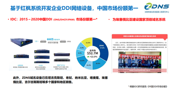 依托红枫系统,ZDNS打造了亚洲第一大(注册量)新顶级域服务平台,托管运行全球50多个顶级域名,为全球网民提供高效、便捷的互联网基础服务;研发了DDI(DNS、DHCP、IPAM)核心网络设备,覆盖金融、政府、教育、大型企业、广电、互联网等全球上千家企业,支撑企业构建核心网络控制枢纽,连续多年排名国内市场份额第一,在门槛最高的金融行业的市场占有率更是超过50%。