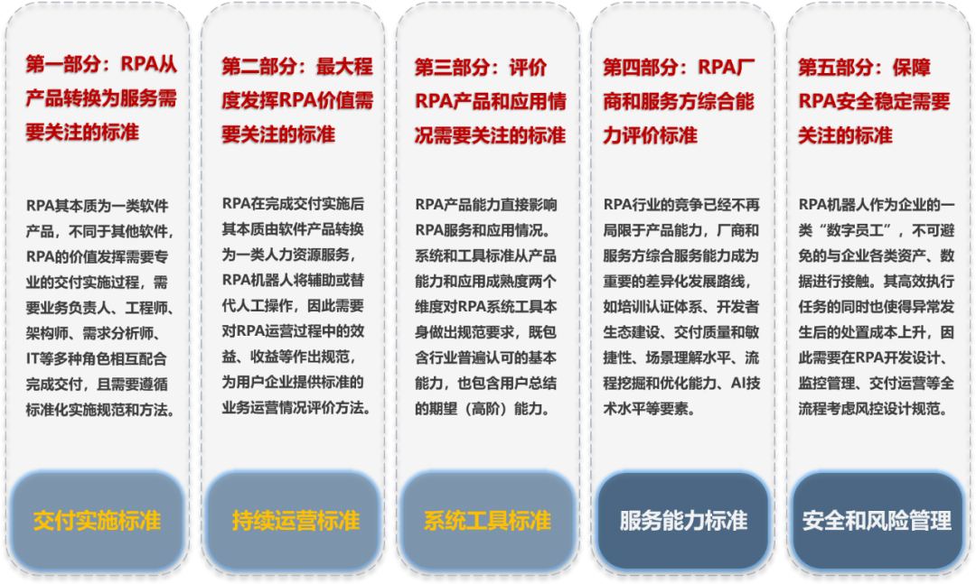 系统和工具标准定稿发布,标准体系日趋完善。RPA产业推进方阵(RUIDA)研究制定的RPA标准体系《机器人流程自动化能力系列评估方法》包括交付实施、持续运营、系统和工具、服务能力、安全和风险管理五部分。系统和工具部分已于2021年2月阶段性定稿,交付实施和持续运营部分的编制工作已经启动,预计2021年11月定稿发布。