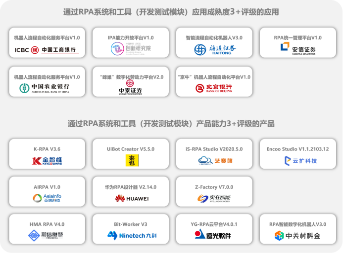 1、开发测试模块。主要面向RPA系统和工具中的机器人设计端进行测试,如开发模式、开发模板、功能组件等,检测RPA开发测试的基础能力和创新应用能力。