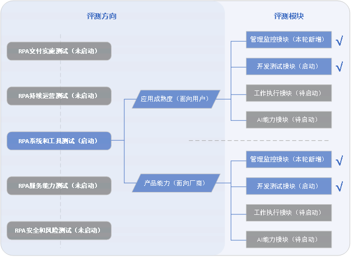 本轮RPA系统和工具评测面向RPA用户方和厂商开展,分别测试应用成熟度和产品能力,具体方向有: