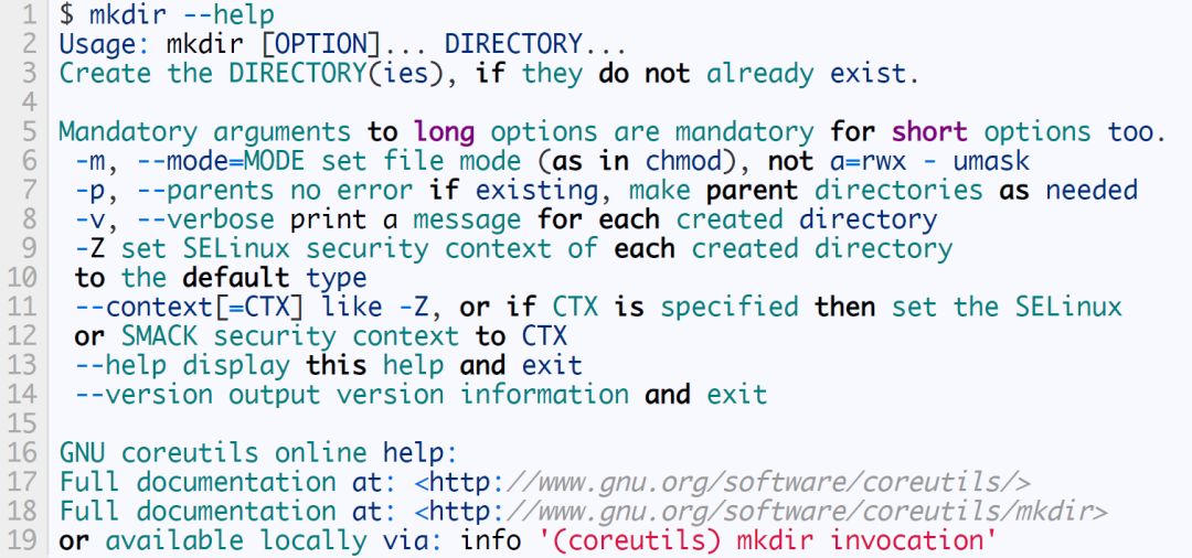 对于大多数 Linux 命令,都可以通过在输入命令后加上选项 --help 来获得这个命令的作用、用法以及它的一些相关信息。除了 man 命令之外, --help 选项可以让你在不使用所有扩展选项的情况下获取到所需要的内容。