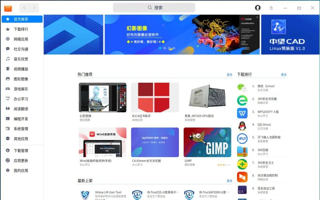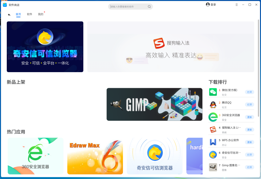 第二步,打开应用商店,进入以下界面,可在上方搜索框输入需要下载的软件名称,然后下载安装。