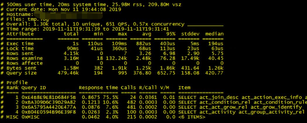 当时我是临时开启了参数log_queries_not_using_indexes,得到了一些补充的慢日志信息,然后快速关闭,拿pt工具做了下分析,很快得到了一个简单的报告内容: