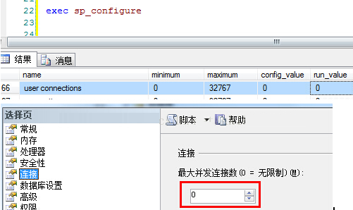 我们可以查看 SQL Server 设置的最大连接数,[userconnections] run_value=0(默认值为0即最大值32767)