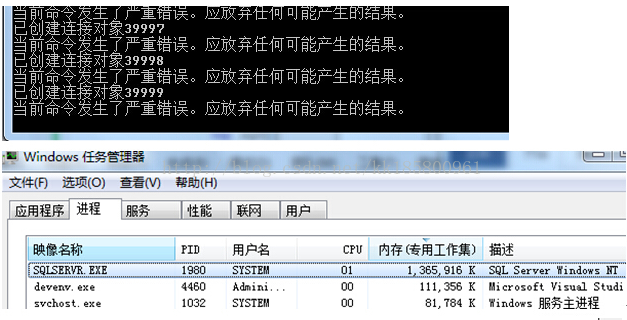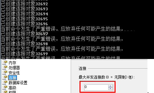 设置max poolsize=40000,即连接池40000,MSSQL 连接限制0(32767)。循环次数:40000