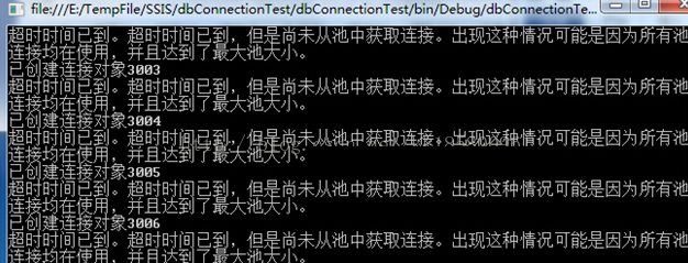 for (int i = 0; i < maxCount; i++){Console.WriteLine(string.Format("已创建连接对象{0}", i));try{sqlConn.Open();Console.WriteLine("已打开");Console.ReadKey(true);sqlConn.Close();Console.WriteLine("已关闭");Console.ReadKey(true);}catch (Exception e){Console.WriteLine(e.Message);}}