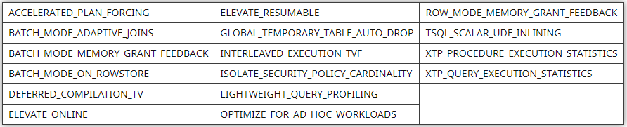 有五个新的 USE HINT 选项,包括禁用批处理模式或禁用自适应内存授予反馈的方法,如下所示: