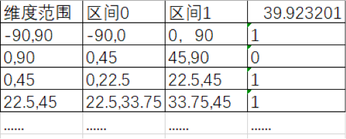 纬度的范围是(-90,90),其中间值为0。对于纬度39.923201,在区间(0,90)中,因此得到一个1;(0,90)区间的中间值为45度,纬度39.923201小于45,因此得到一个0,依次计算下去,即可得到纬度的二进制表示,如下表:
