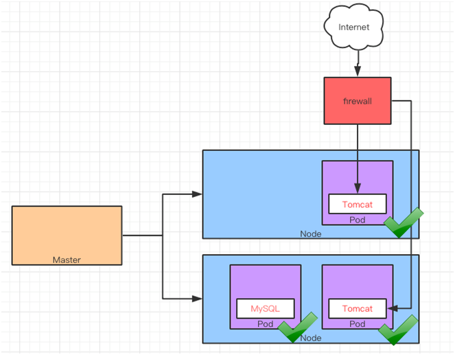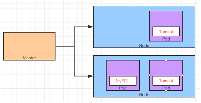 假设使用 Kubernetes 部署 Tomcat 和 MySQL 服务到两个 Node 上面。其中 Tomcat 服务生成两个实例也就是生成两个 Pod,用来对其做水平扩展。