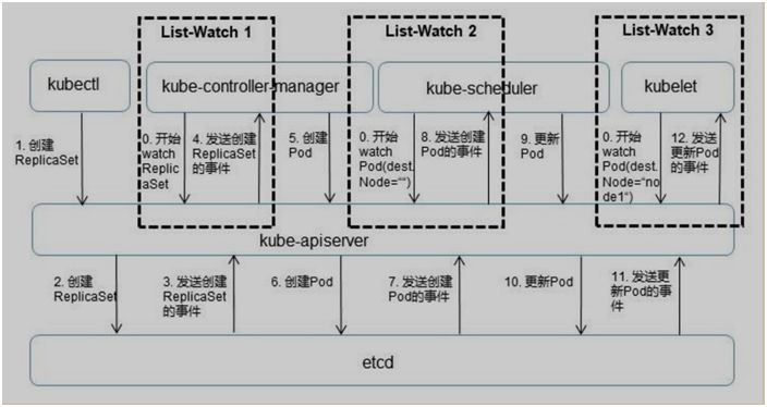 这里有三个 List-Watch,分别是 kube-controller-manager(运行在Master),kube-scheduler(运行在 Master),kublete(运行在 Node)。他们在进程已启动就会监听(Watch)APIServer 发出来的事件。
