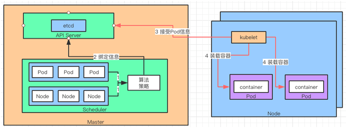 由于 Scheduler 在监听(Watch)APIServer,并且它在系统中起到了“承上启下”的作用,“承上”是指它负责接收创建的 Pod 事件,为其安排 Node;“启下”是指安置工作完成后,Node 上的 kubelet 服务进程接管后继工作,负责 Pod 生命周期中的“下半生”。