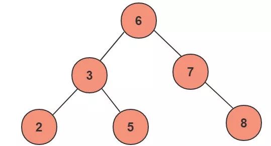 上图为一个普通的二叉查找树,按照中序遍历的方式可以从小到大的顺序排序输出:2、3、5、6、7、8。