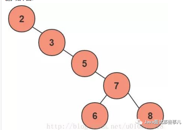 一个二叉查找树是由n个节点随机构成,所以,对于某些情况,二叉查找树会退化成一个有n个节点的线性链。如下图: