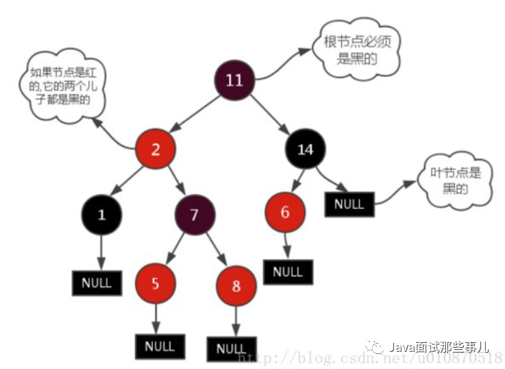 3、每个叶节点(叶节点即树尾端NULL指针或NULL节点)都是黑的;